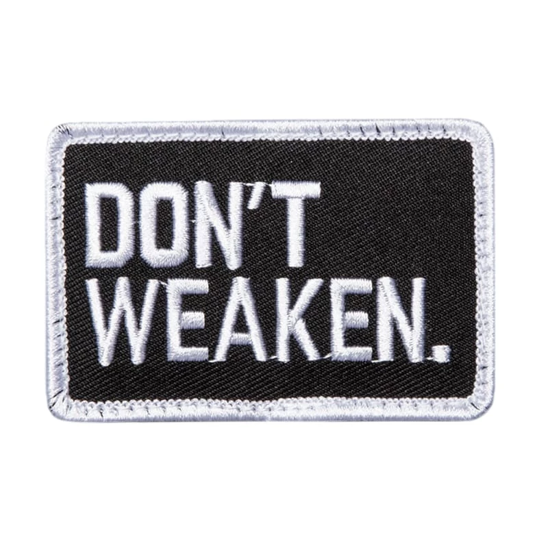 This 3×2” motivational Rogue patch features the “Don’t Weaken” slogan, with white stitching on a black background + a white border.