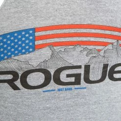 The design features the Rogue “R” logo on the chest and an original graphic on the back, combining the Rogue logo with Rocky mountaintops, an American flag, and the “Just Gaux” slogan.